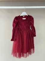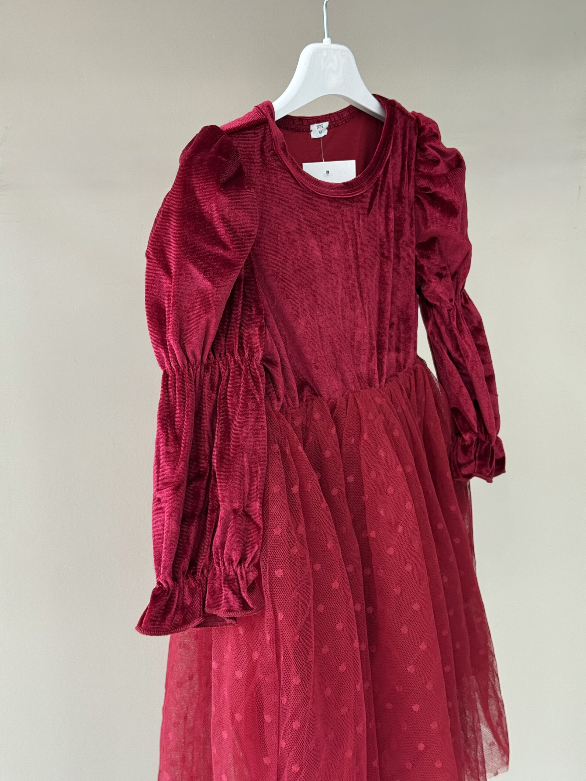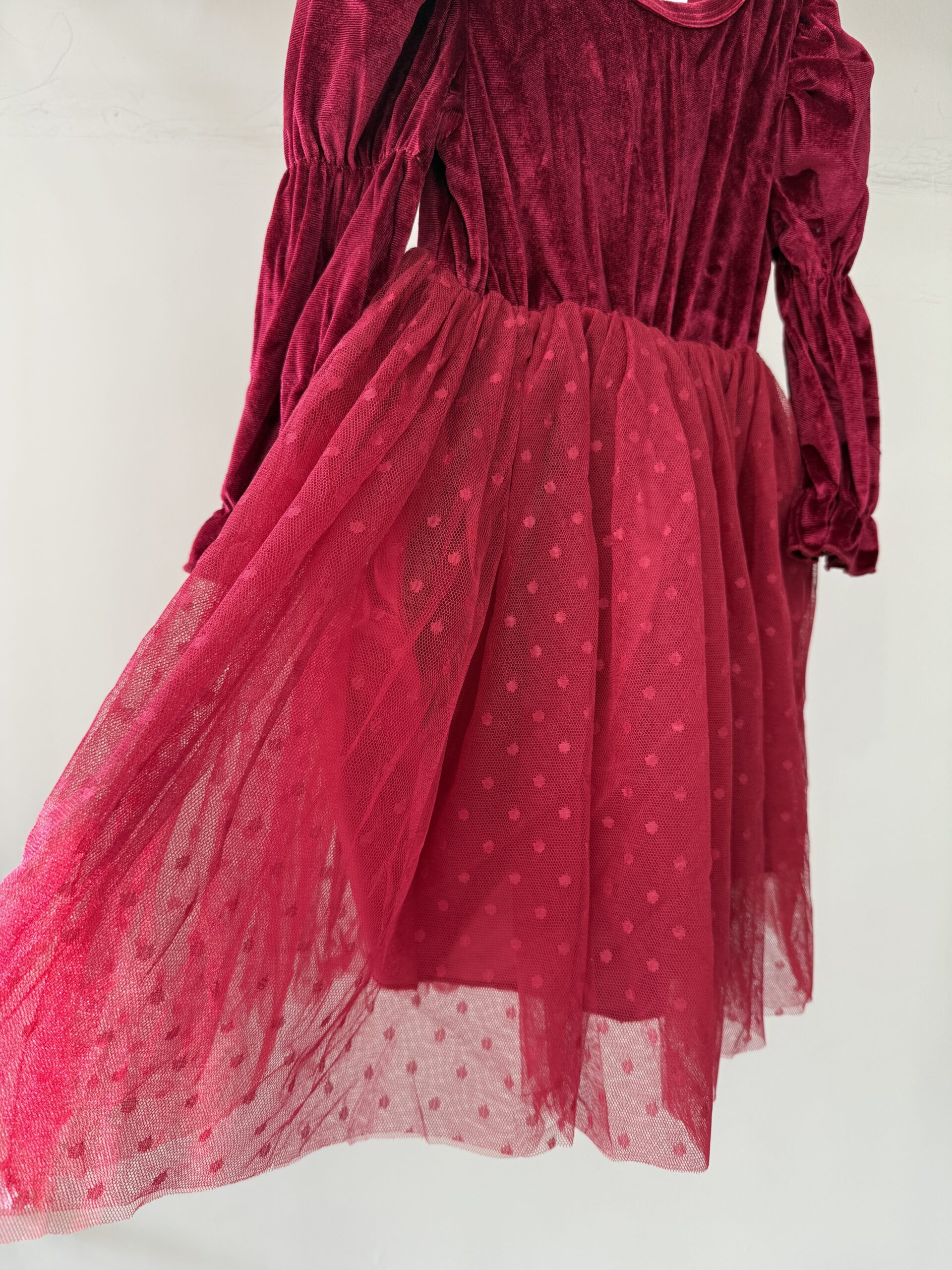 This luxurious long-sleeved dress is crafted for making an unforgettable entrance. The bodice and sleeves are made from a deep, rich cranberry velvet that is soft to the touch and catches the light beautifully. Dramatic gathered puff sleeves finish with ruffles at the wrist, adding a sophisticated flair. The skirt features layers of matching tulle, detailed with delicate polka dots, creating a dreamy, full silhouette perfect for twirling.