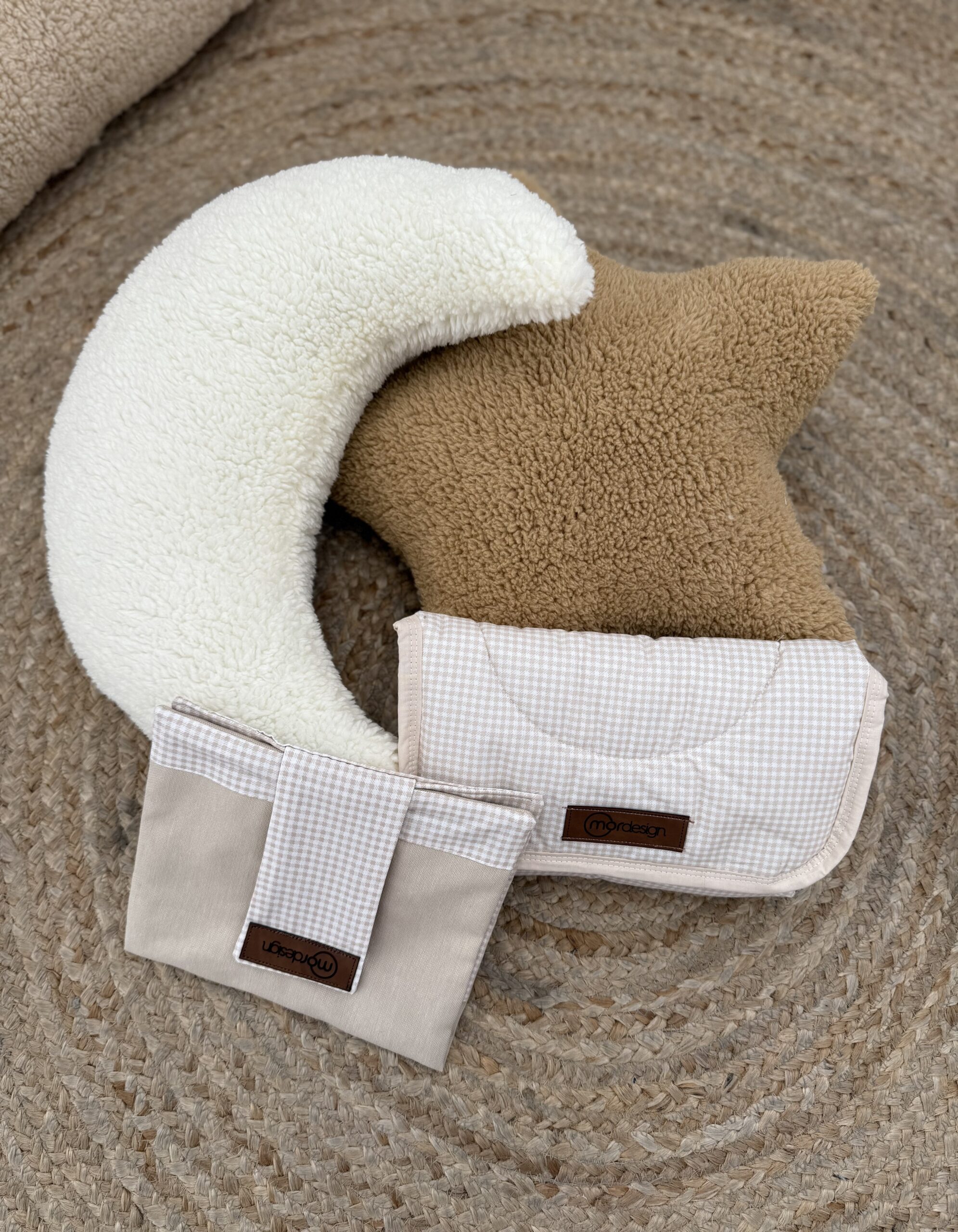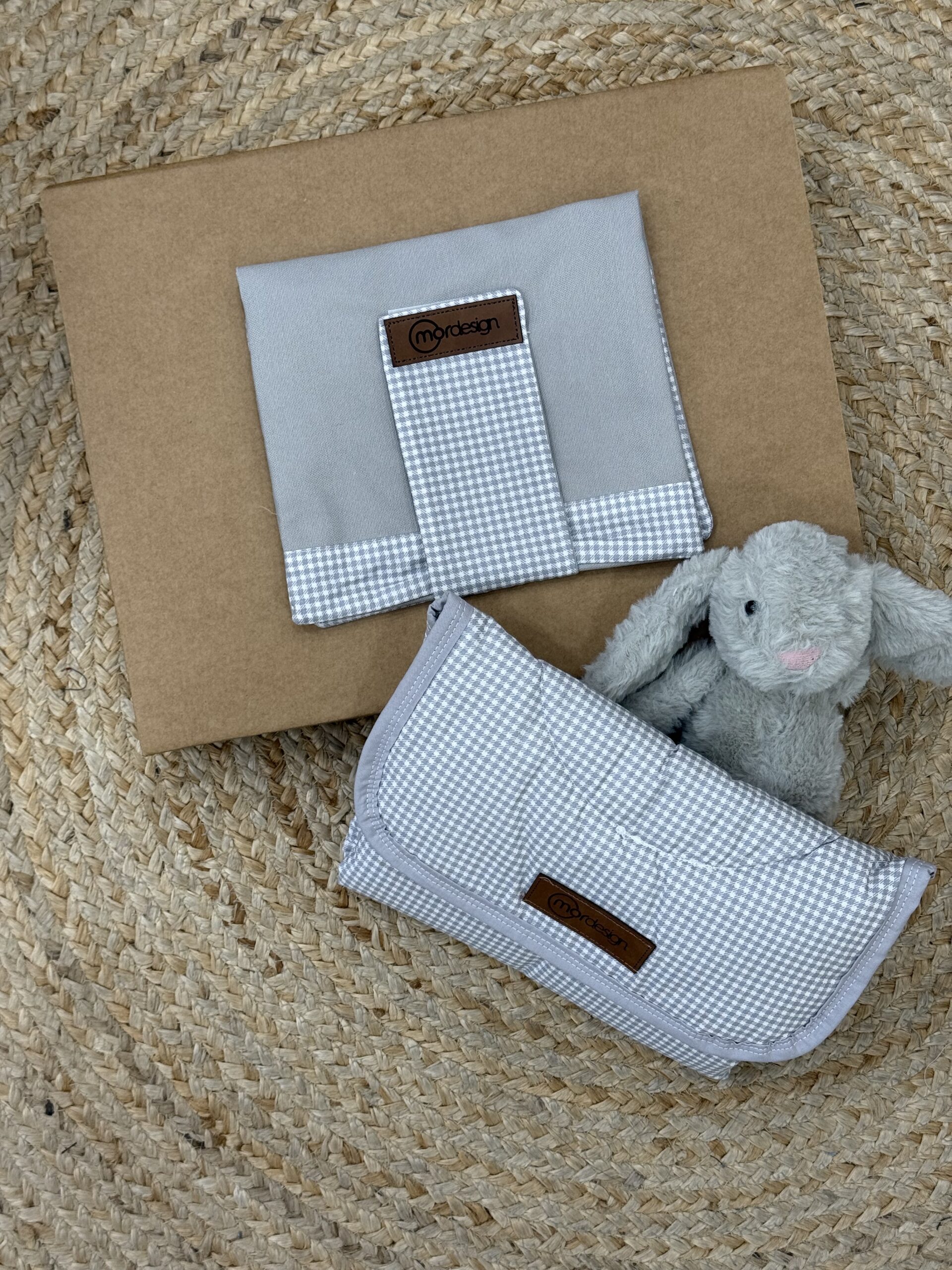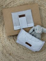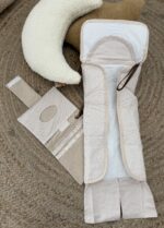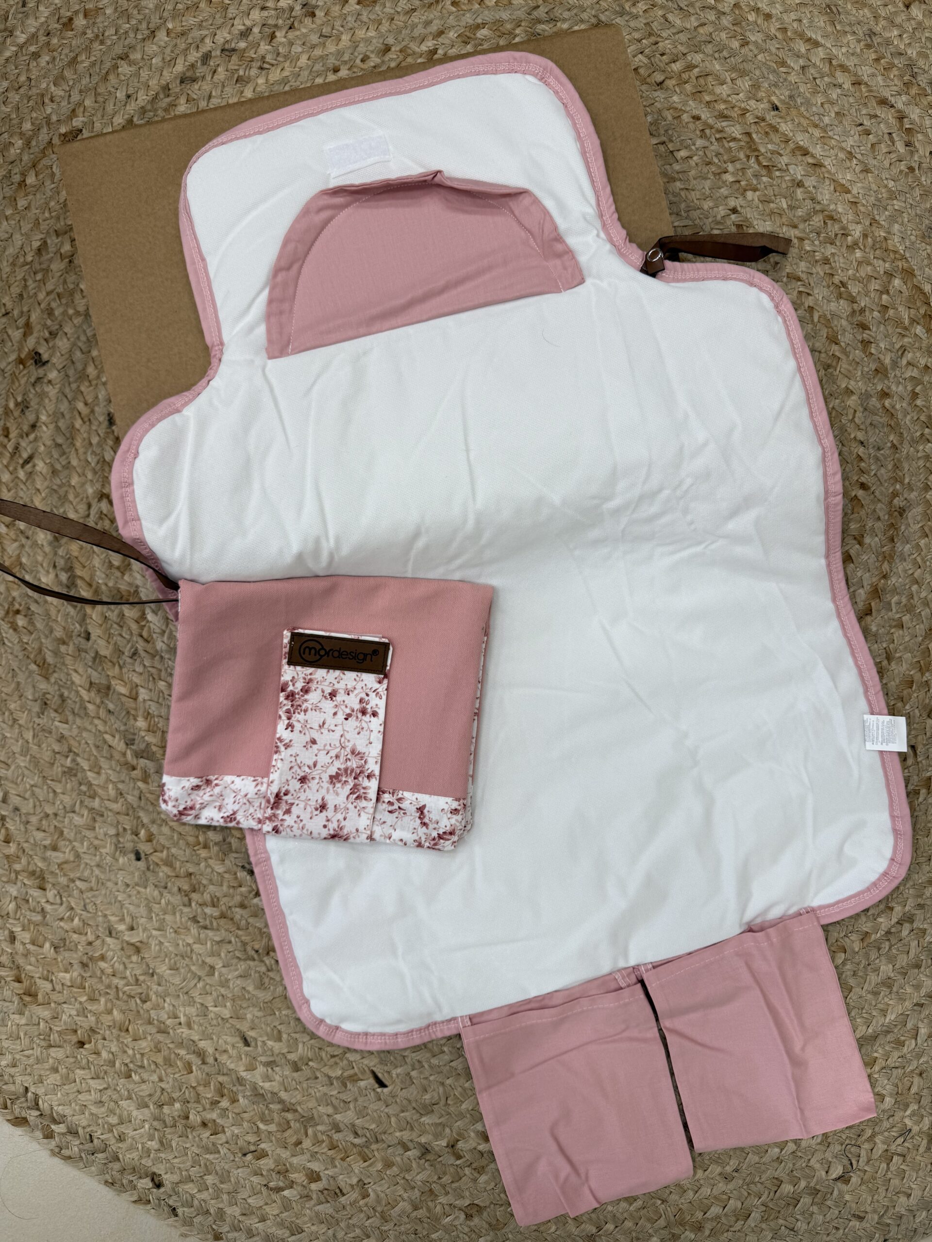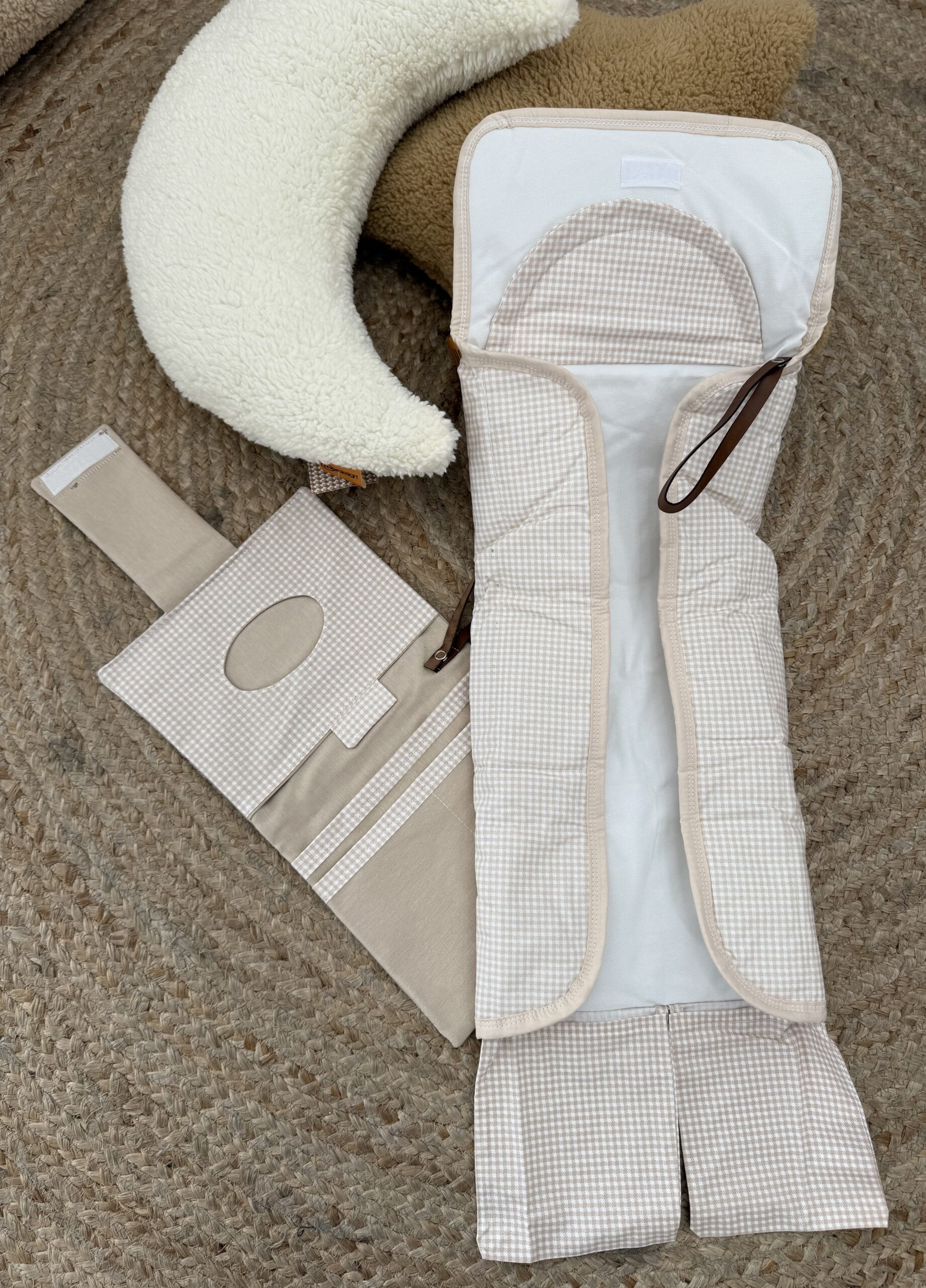 The accompanying piece is a matching detachable folding organizer pouch that includes multiple storage pockets for diapers and wipes, and secures with dark brown leather-look straps.