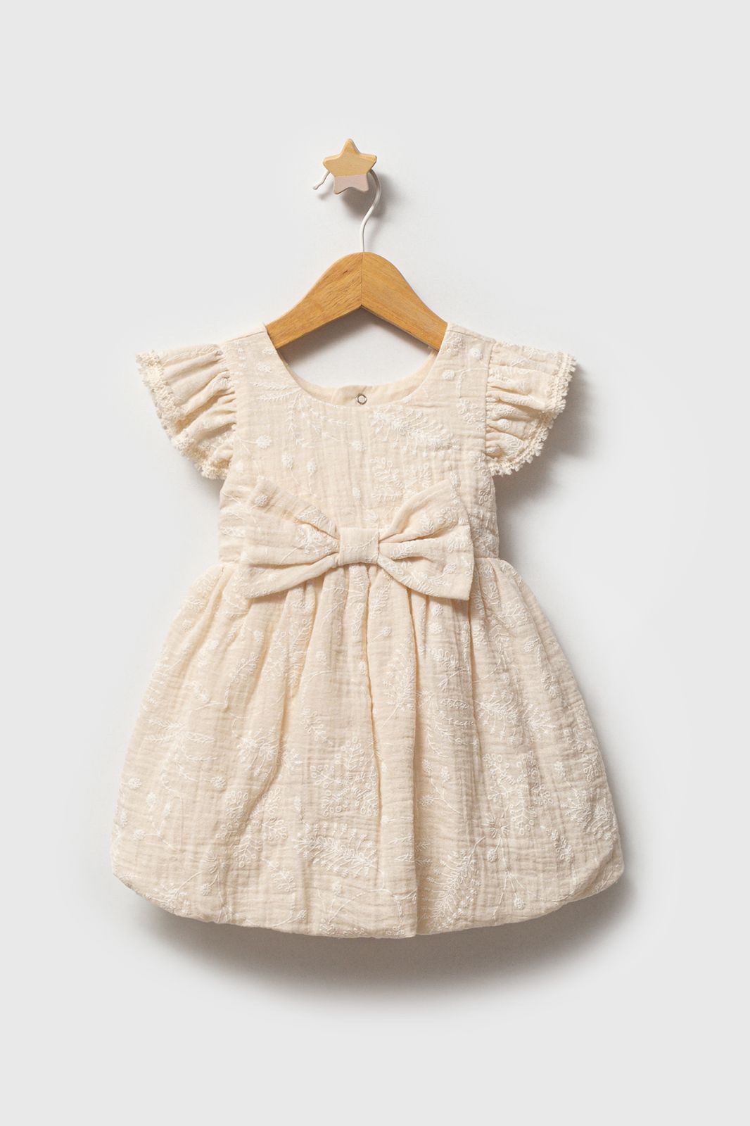 The Girls Cream Bow Embroidered Dress is designed with charming details for special occasions. This dress features a soft cream color, elegant all-over embroidery, a large statement bow at the waist, and delicate flutter sleeves. The lightweight fabric makes it comfortable for your child to wear throughout any celebration.