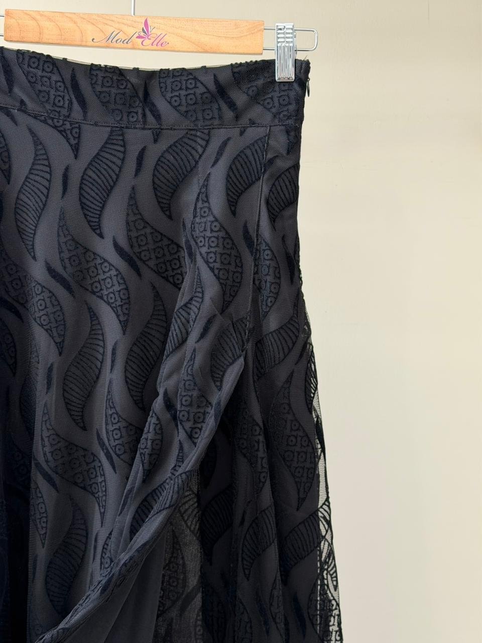 Black mesh overlay geometric print skirt with side slit