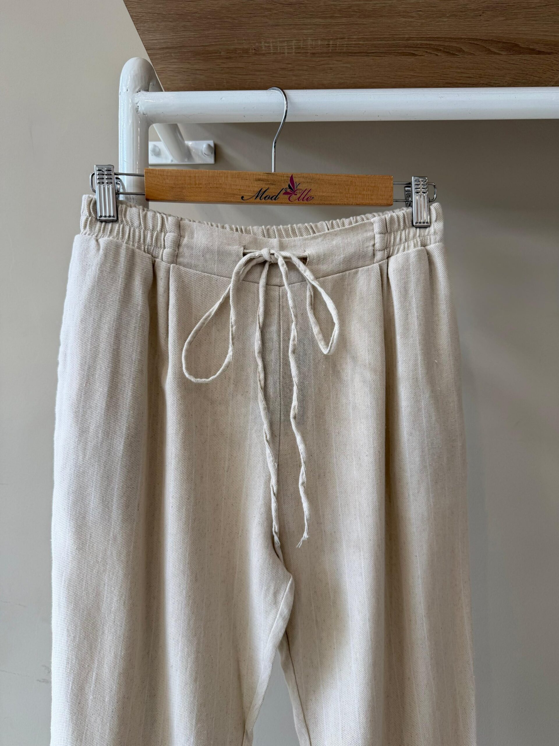 Drawstring waist beige linen pants