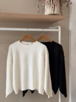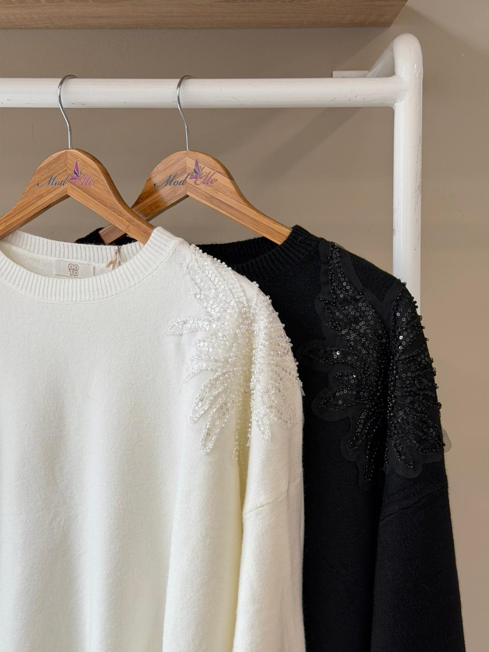 A statement piece for any wardrobe, this soft crew neck sweater featured delicate, hand-applied sequin and bead embroidery across the shoulders in a striking wing design. It instantly elevates a casual knit to a piece of evening-ready elegance.