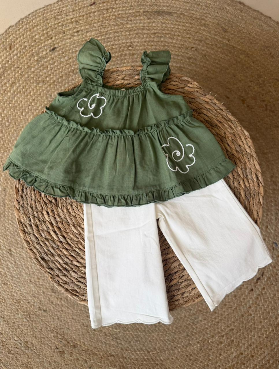 Green Ruffle Top and White Pants Set