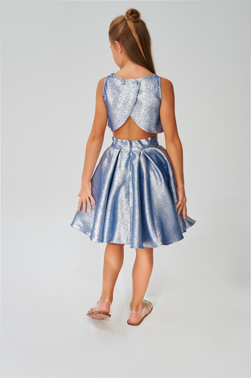 This kids’ Metallic Skirt and Crop Top Set adds sparkle to any special occasion. The co-ord set includes a shiny blue metallic sleeveless crop top with a front bow detail and keyhole accent, paired with a matching flared skirt. Ideal for parties and festive celebrations.