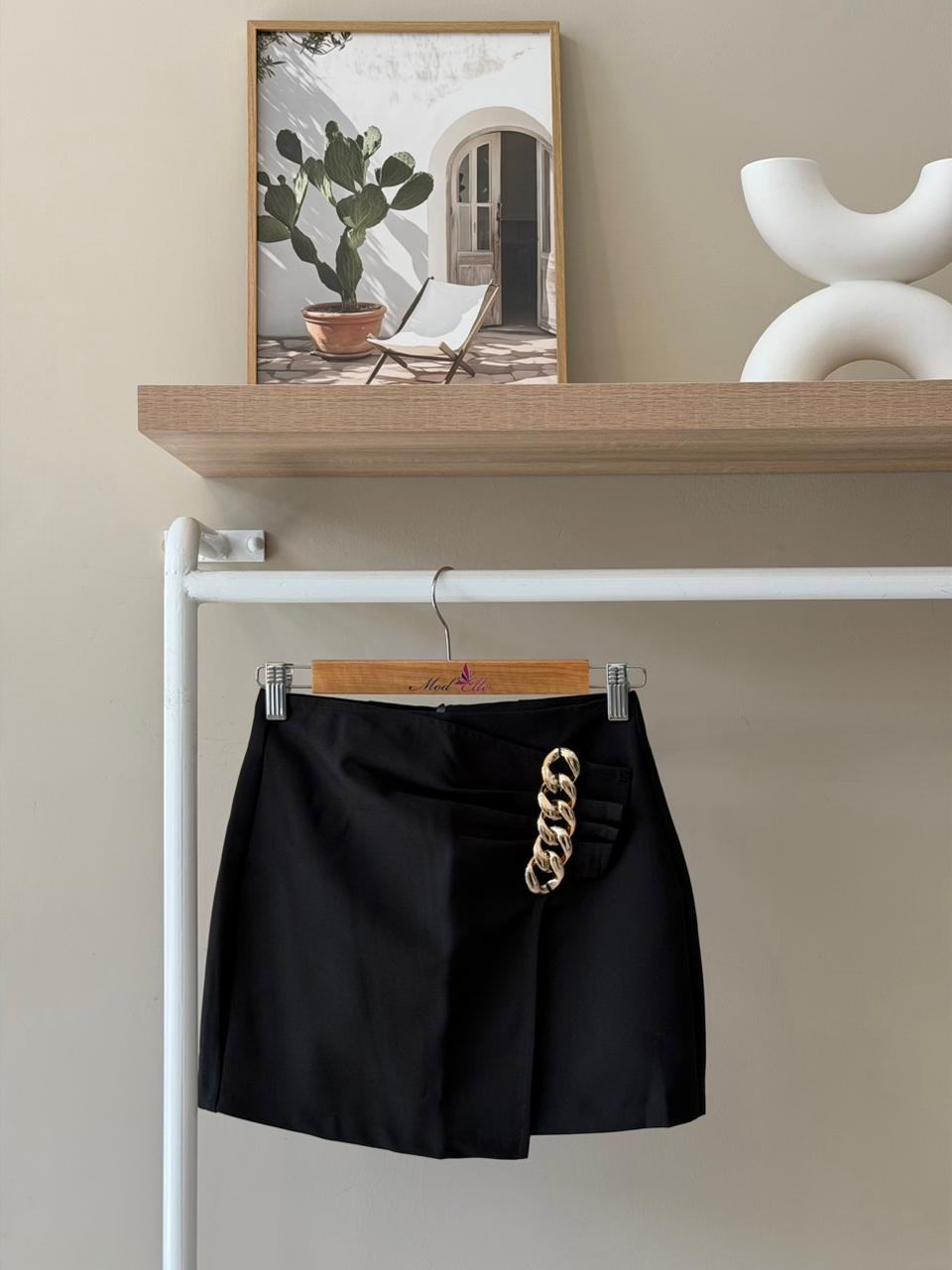 Gold chain detail mini black skirt