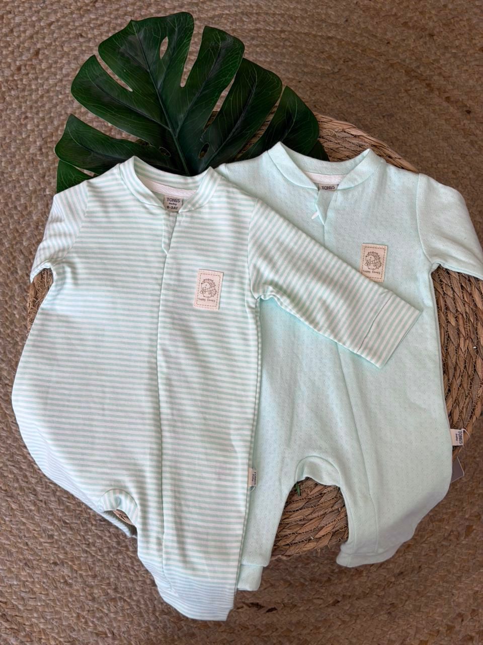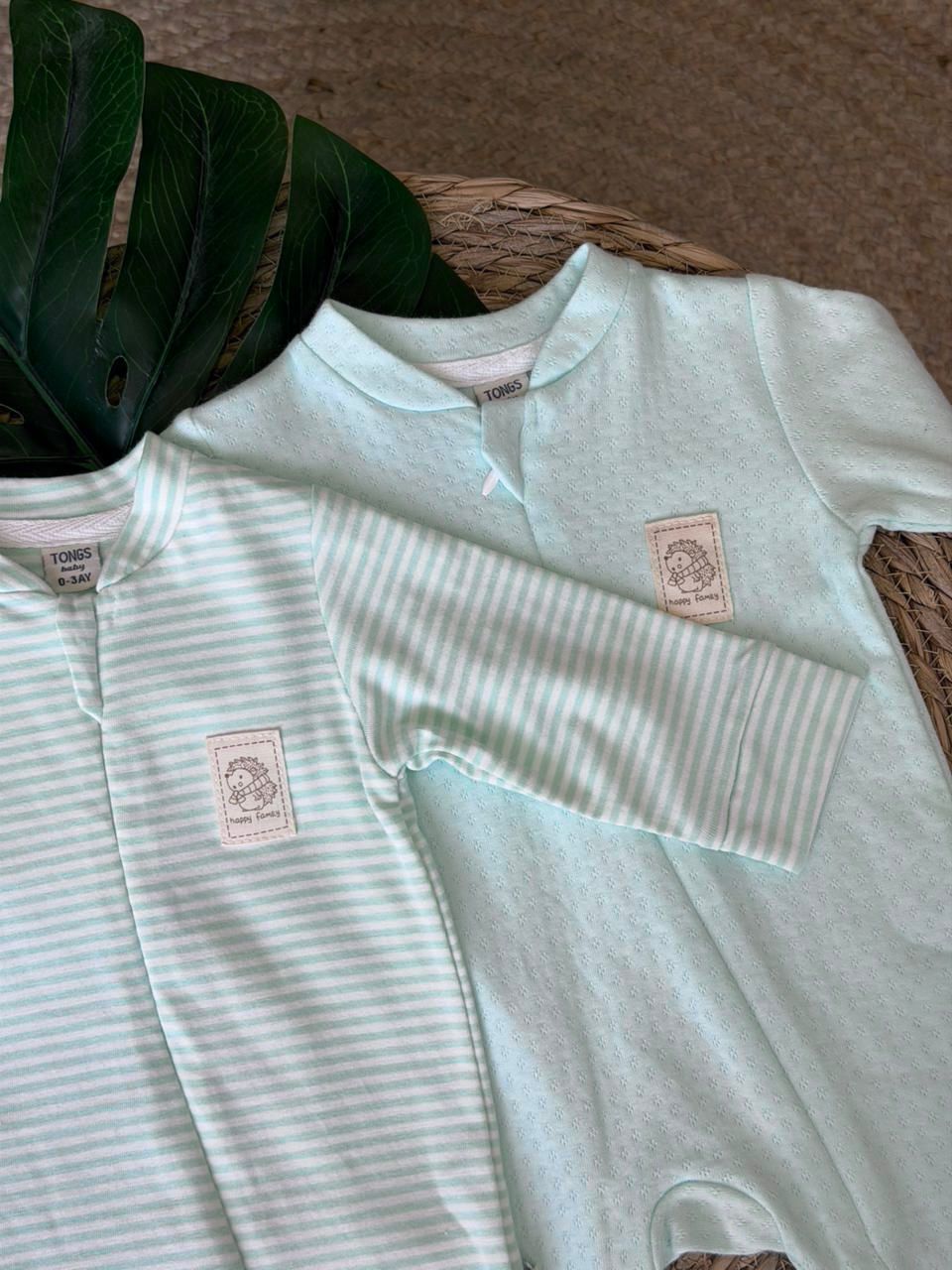 This Mint Green Baby Romper and Sleepsuit Set includes two soft, long-sleeve essentials for your little one. The set features a striped sleepsuit and a solid mint romper, both with practical front closures for easy changing. Made in soothing mint green shades, these outfits offer comfort and gentle fabric suitable for delicate baby skin. Ideal for day and night wear.