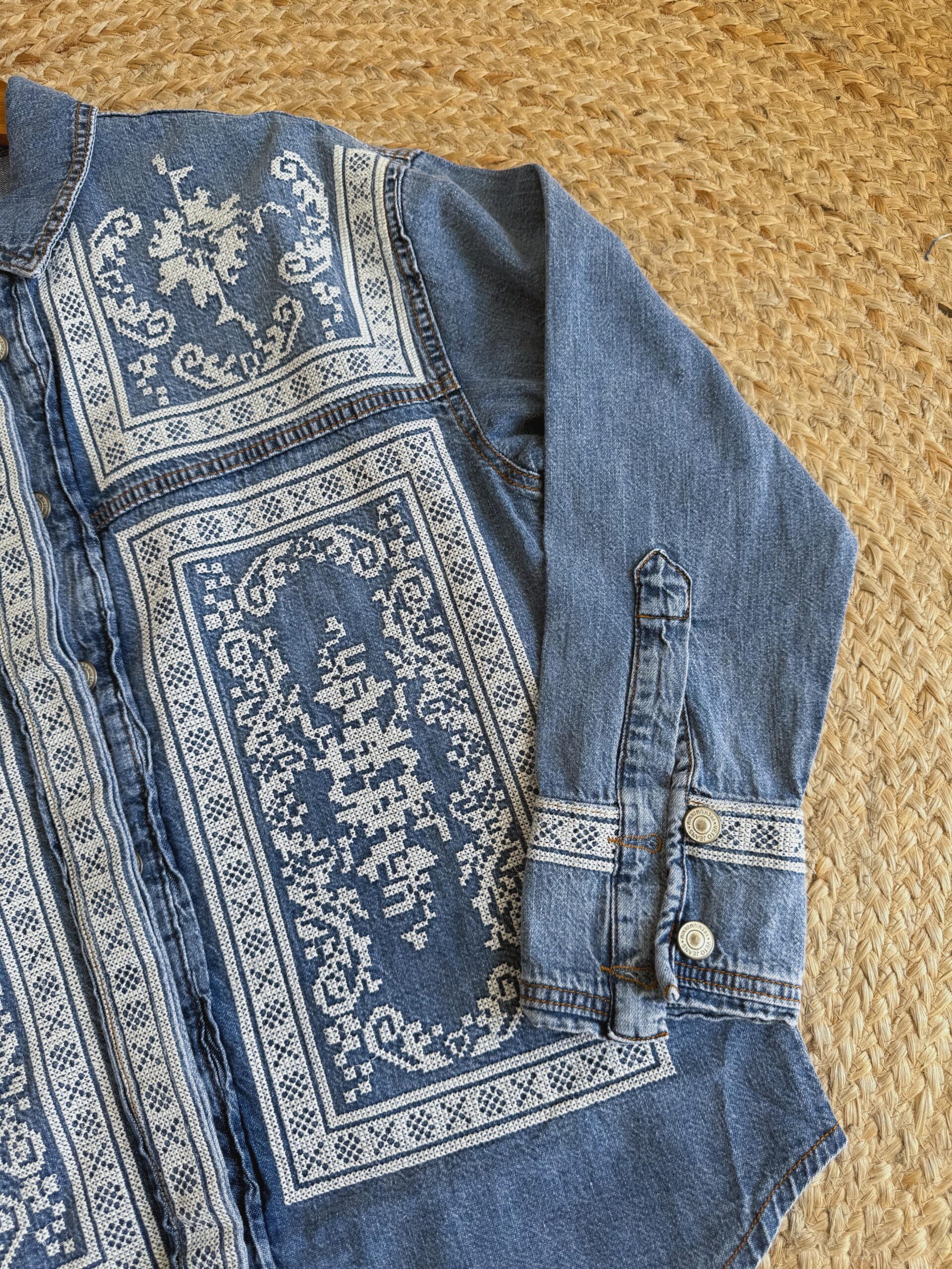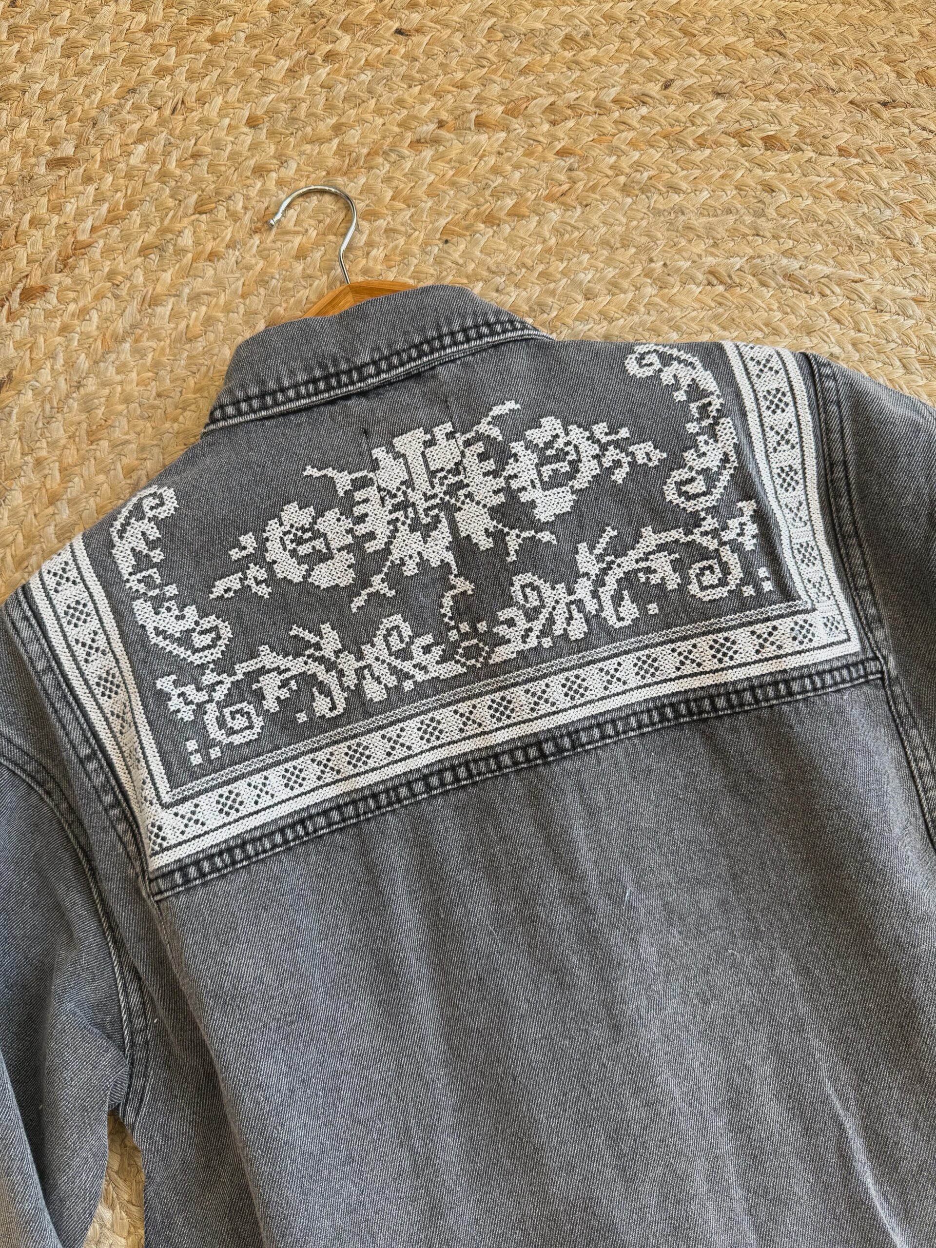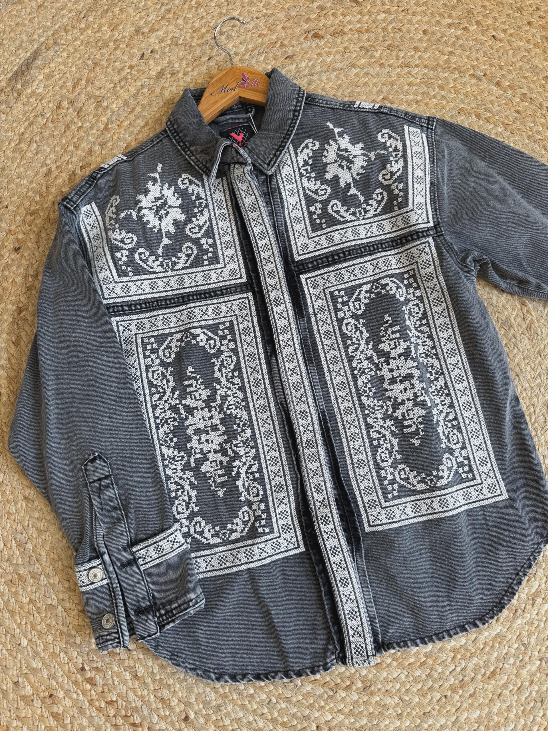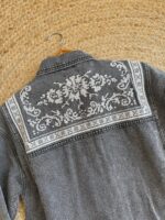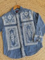 Add a touch of bohemian flair to your wardrobe with this standout denim button-down shirt. The medium-wash denim serves as the perfect canvas for the intricate, folk-inspired pattern that adorns the front & back of the shirt. The detailed design is reminiscent of traditional cross-stitch or embroidery, giving it a handcrafted & unique feel. Complete with a classic collar & cuffs, this shirt offers a relaxed & comfortable fit, making it and excellent choice to layer over a t-shirt or wear it on its own.