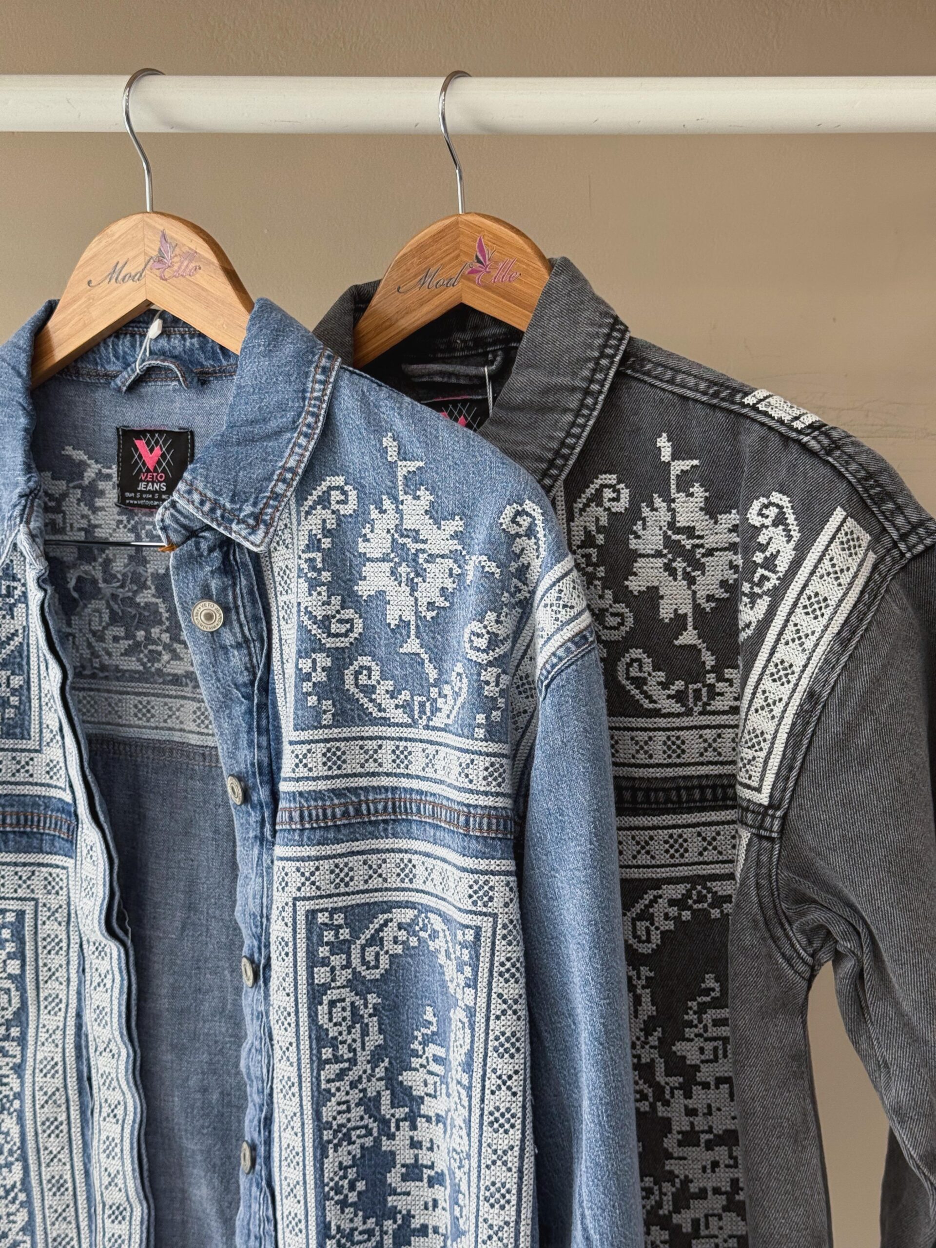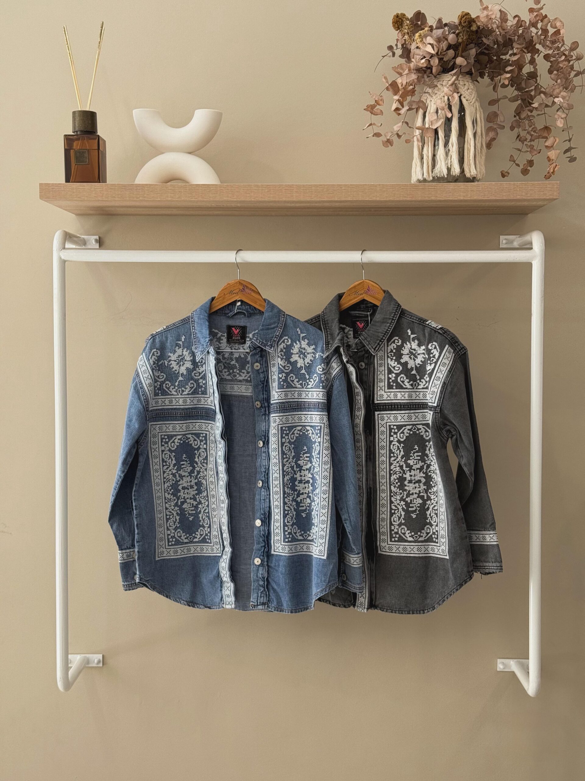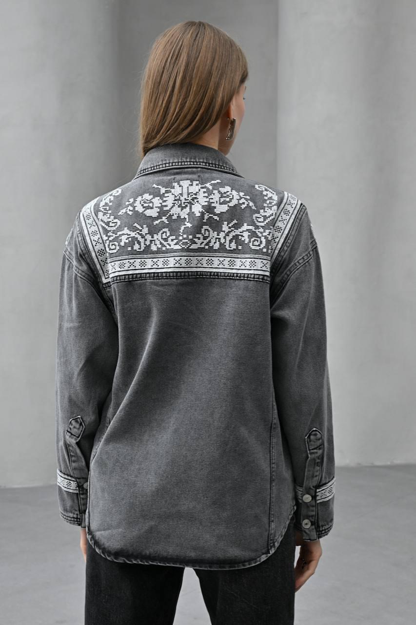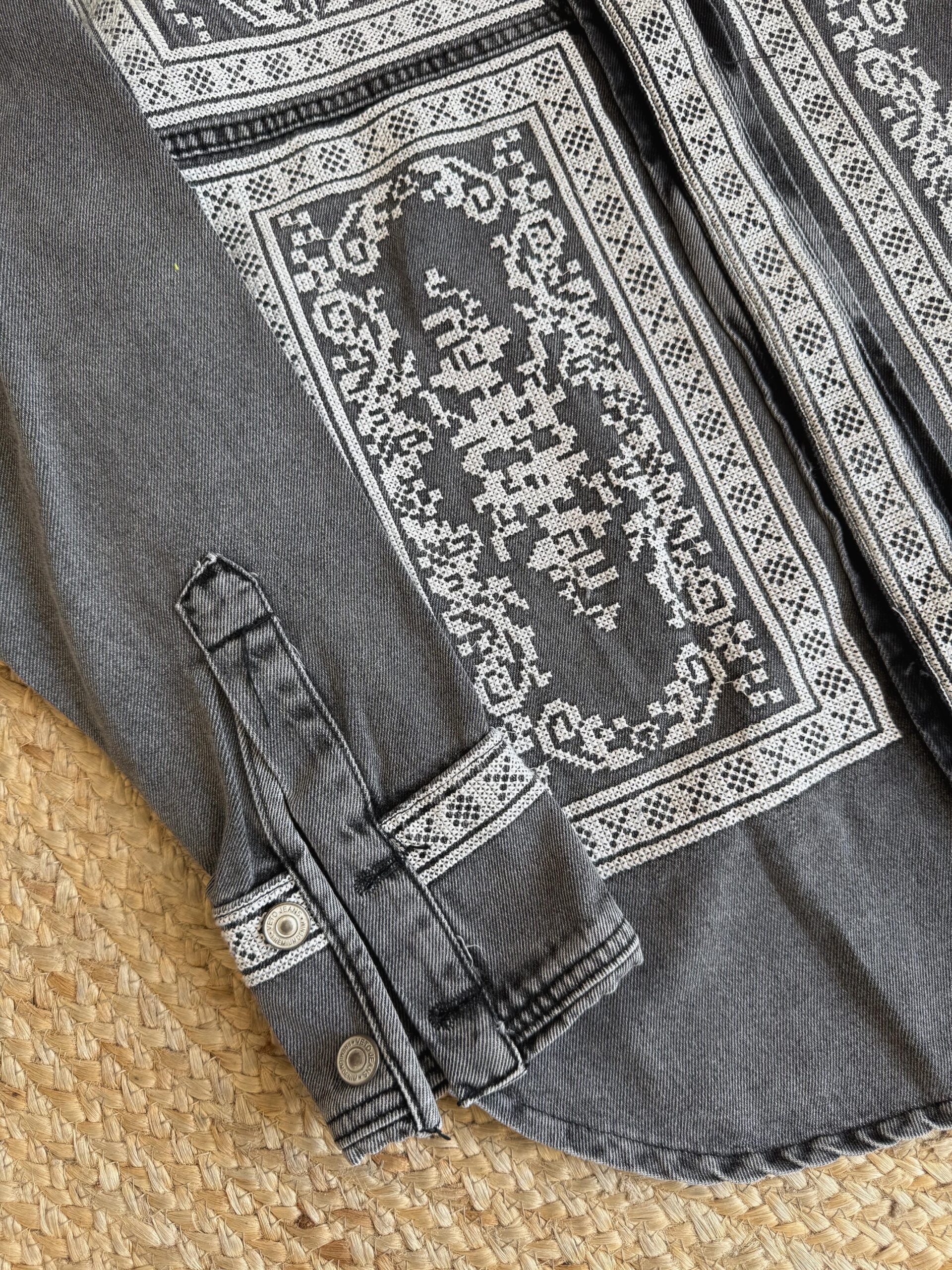 Add a touch of bohemian flair to your wardrobe with this standout denim button-down shirt. The medium-wash denim serves as the perfect canvas for the intricate, folk-inspired pattern that adorns the front & back of the shirt. The detailed design is reminiscent of traditional cross-stitch or embroidery, giving it a handcrafted & unique feel. Complete with a classic collar & cuffs, this shirt offers a relaxed & comfortable fit, making it and excellent choice to layer over a t-shirt or wear it on its own.