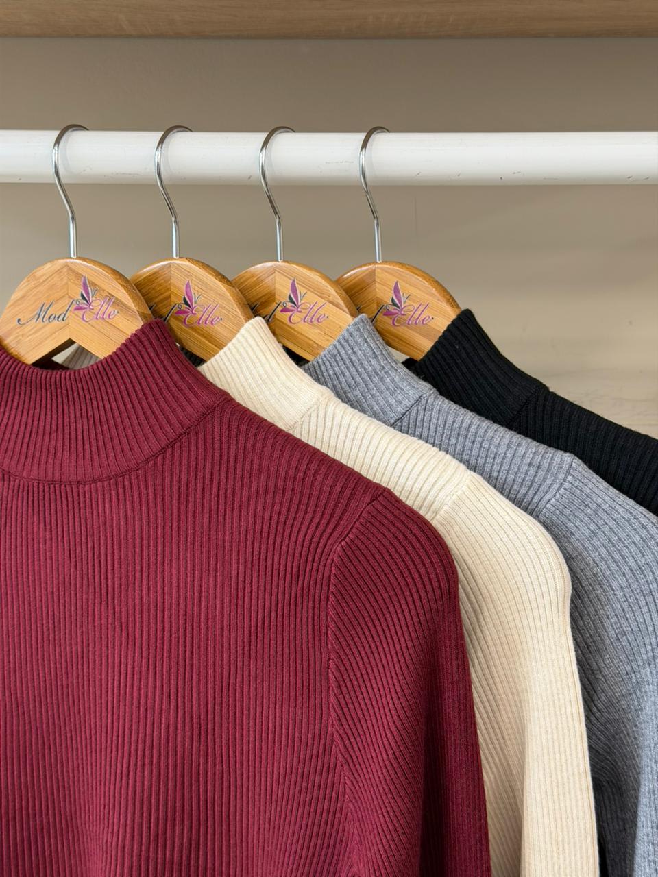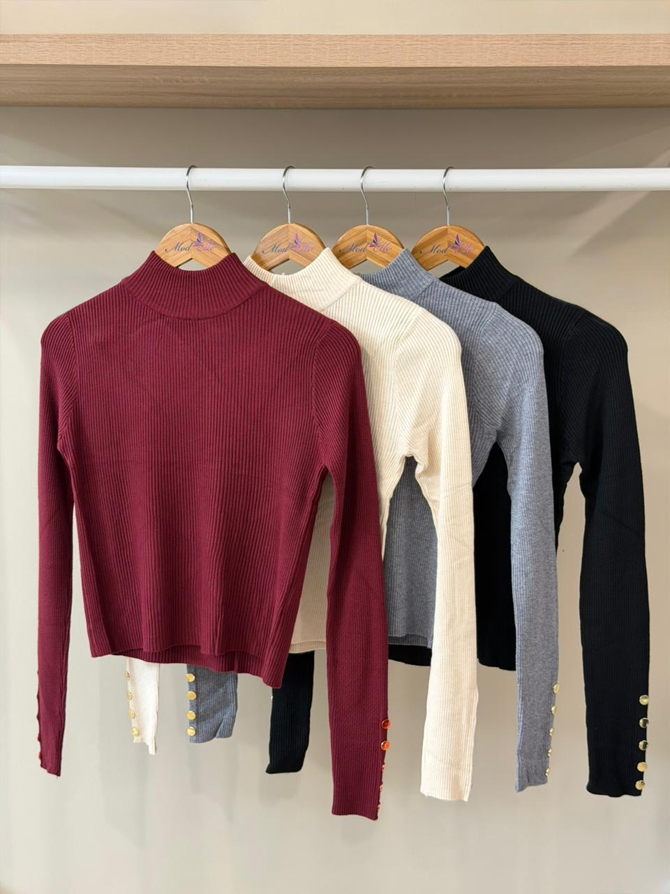 Ribbed knit mock neck sweater with cuff buttons