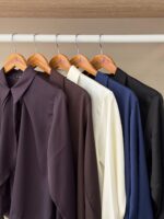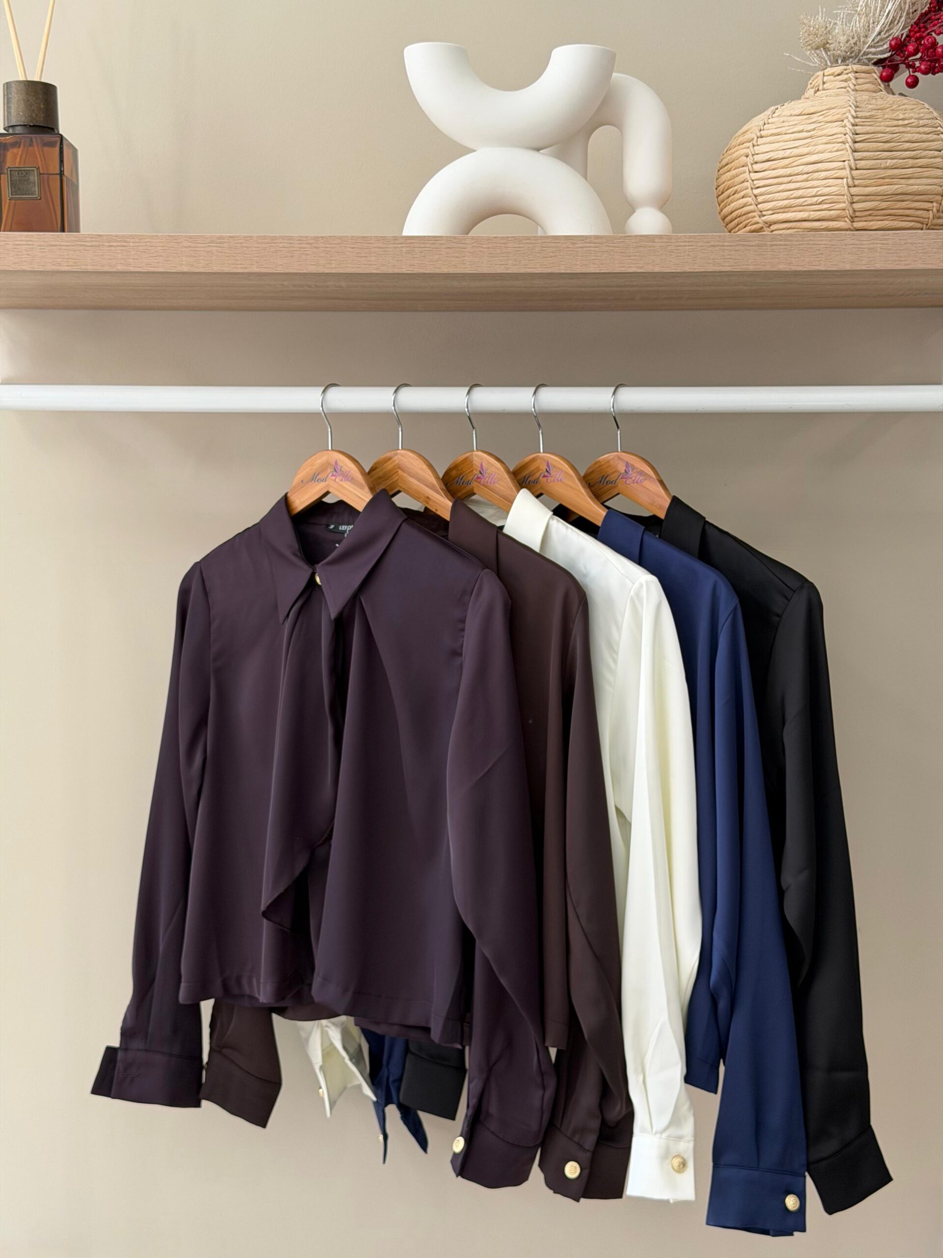 These are elegant, long sleeved shirts made from a smooth, satin fabric. They feature a sophisticated design with a tie neck collar, and the cuffs are secured with decorative gold buttons.