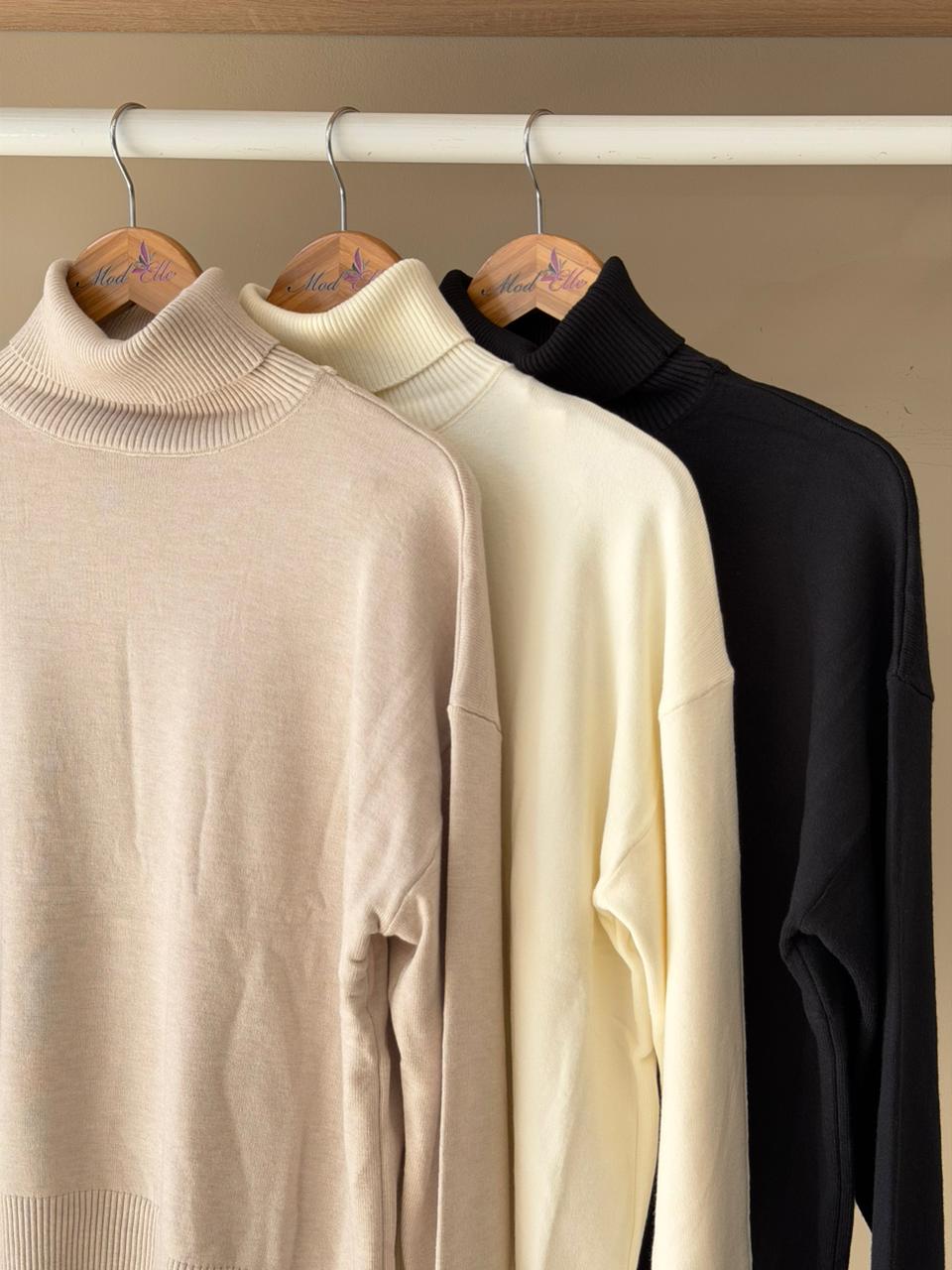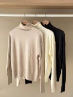 This sweater features a relaxed, comfortable fit and soft knit construction. It has a high, folded collar and subtle ribbed detailing on the cuffs and hem. Fits till size 46.
