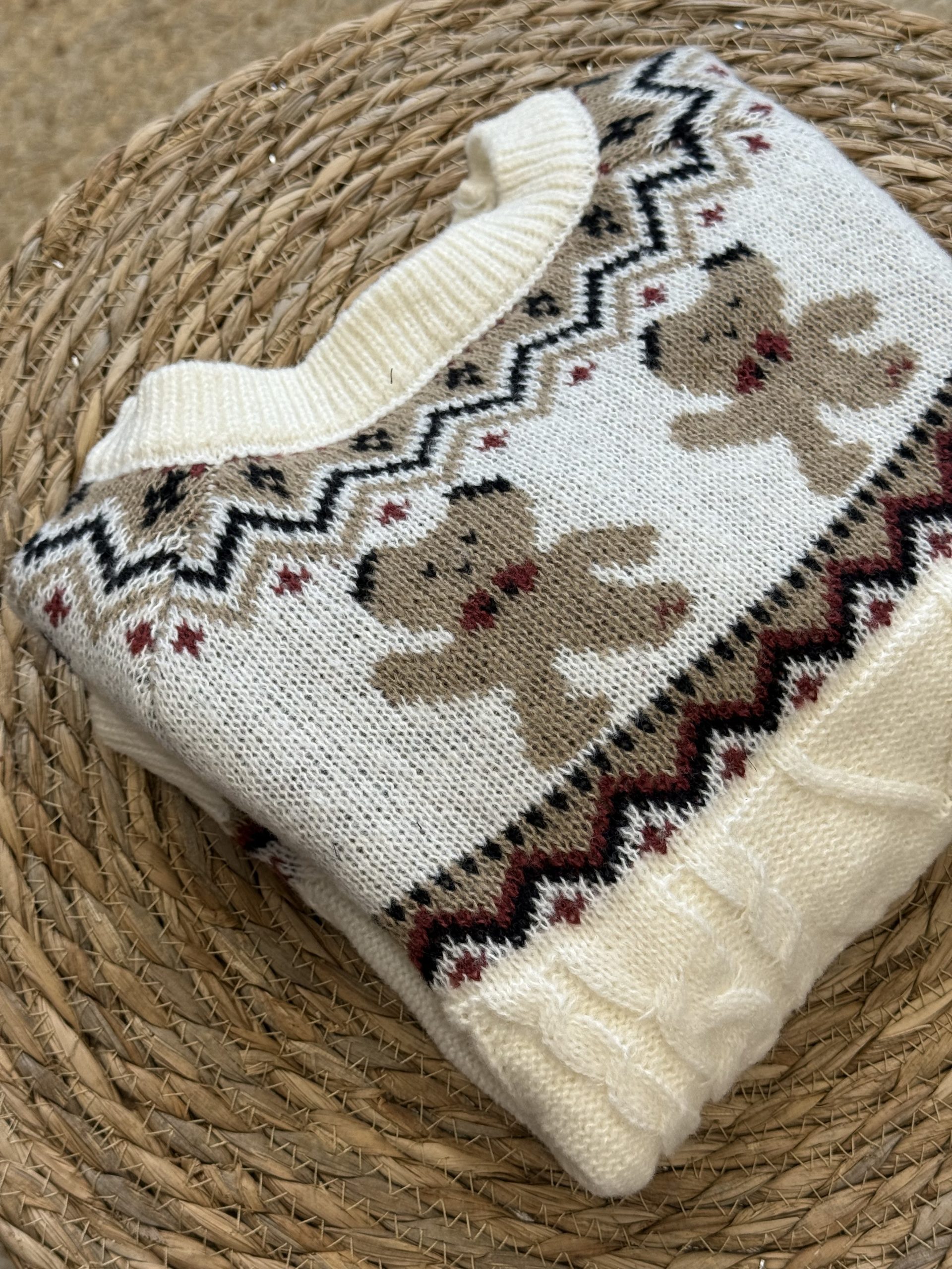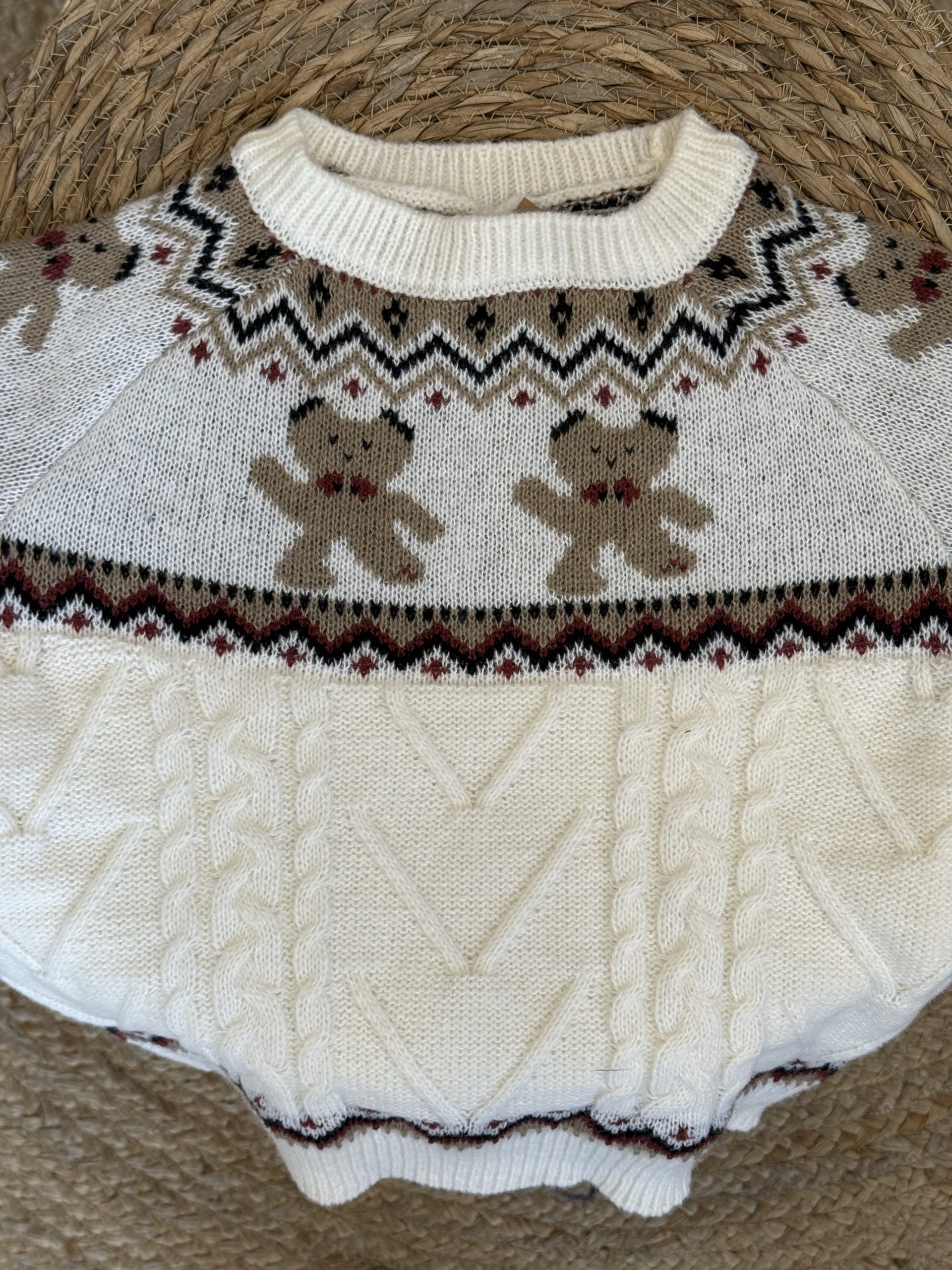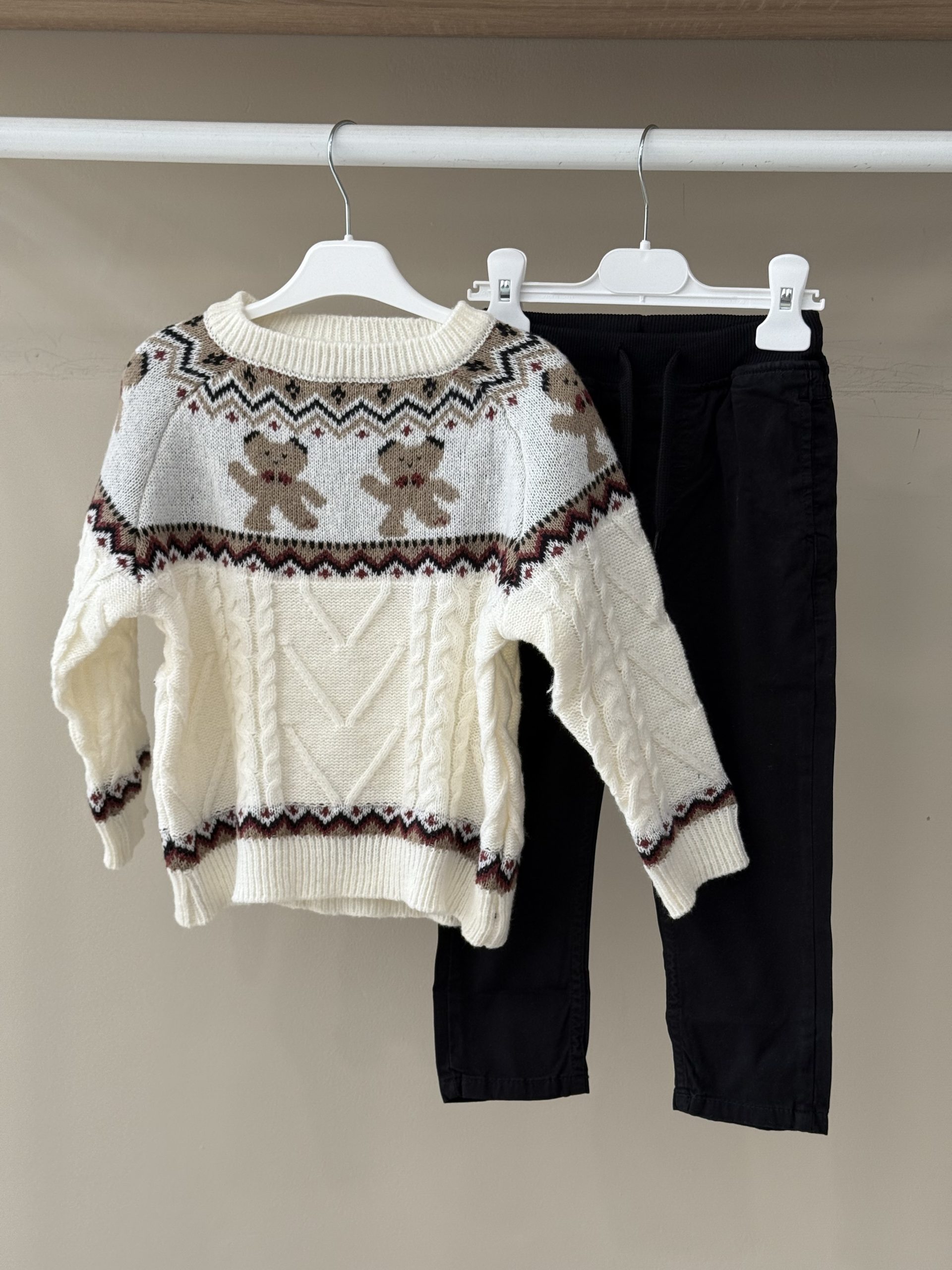 This is a cozy, off-white cable-knit sweater featuring a charming teddy bear Fair Isle pattern in brown, tan, and burgundy. Because of its neutral color and design, this sweater is highly versatile: